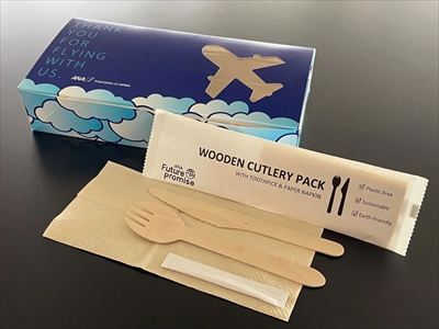 空港ラウンジや機内で使⽤しているすべての使い捨てプラスチック製品を紙やバイオプラスチックなどの環境配慮型素材に変更するなど、プラスチック使⽤量の削減に取り組んでいます。また、ANAは2021年8⽉より順次、⽇本の航空会社として初めて、国際線エコノミークラス機内⾷の主菜容器をプラスチック製から地球環境に優しいバガス素材(サトウキビから砂糖を精製する際に残る茎や葉)に変更しました。